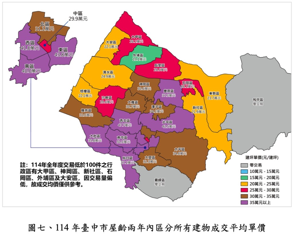2025年台中不分屋齡區分的所有建物,包括大樓、華廈、公寓,成交平均單價,扣除交易量低於150件的行政區後,已無成交均價低於每坪20萬元的行政區。意味著台中房市不論新舊,單價地板已全面定錨在20萬元以上,目前僅存的2字頭低價綠洲為中區、大甲區、清水區及梧棲區,平均單價仍維持在20至25萬元。